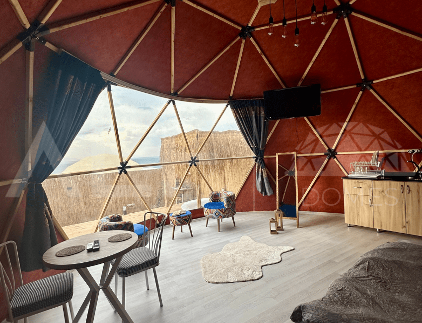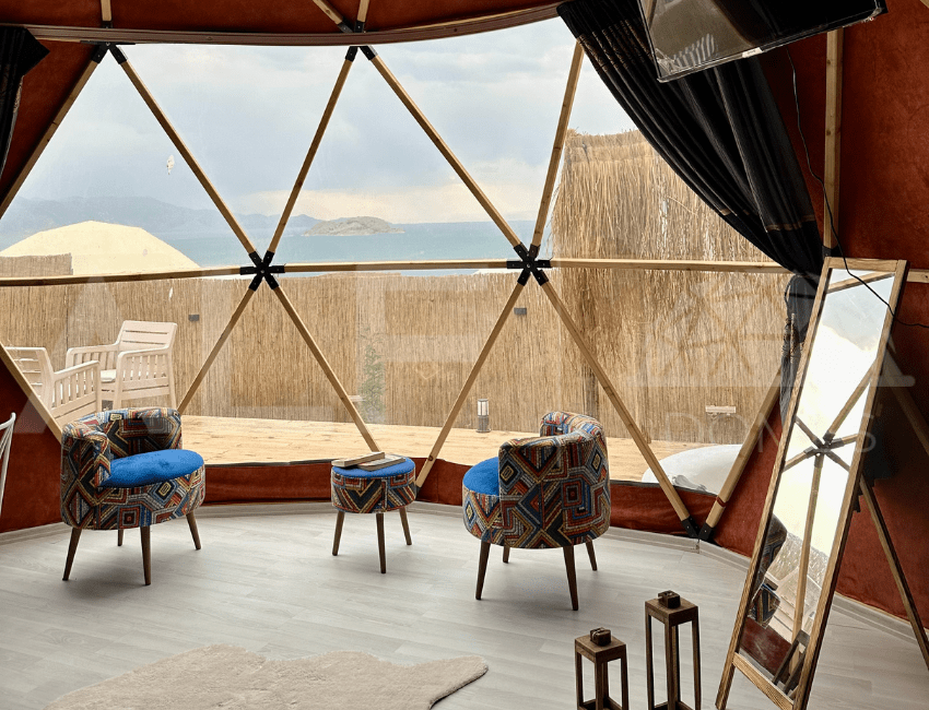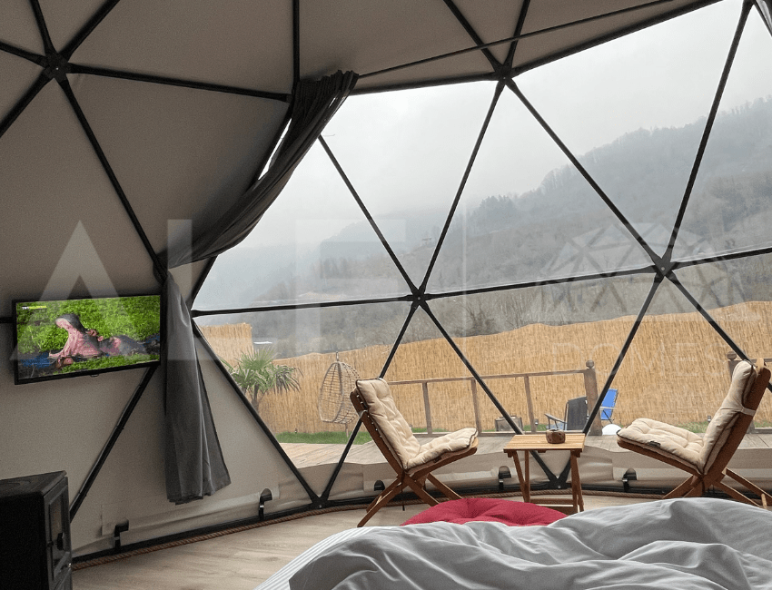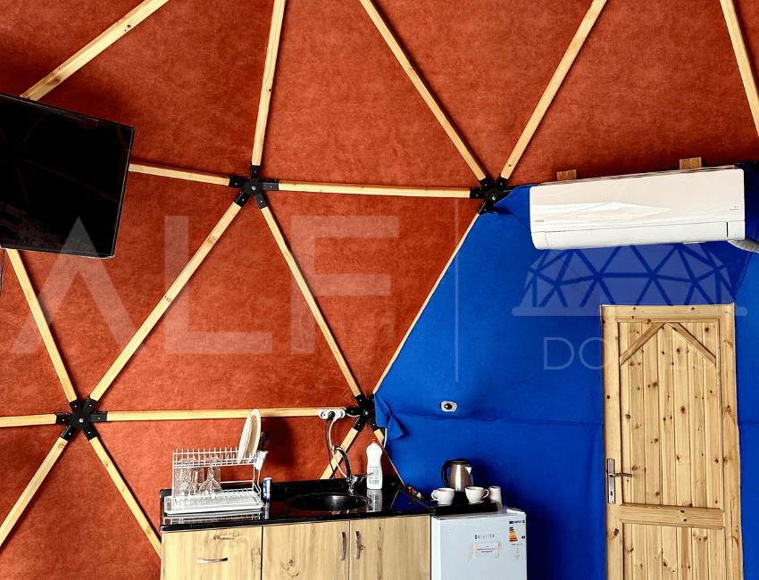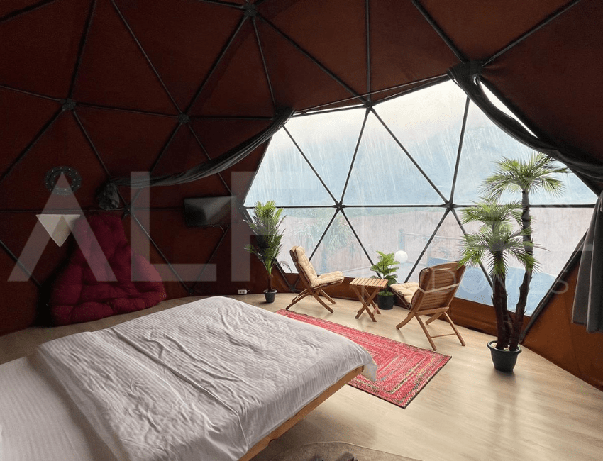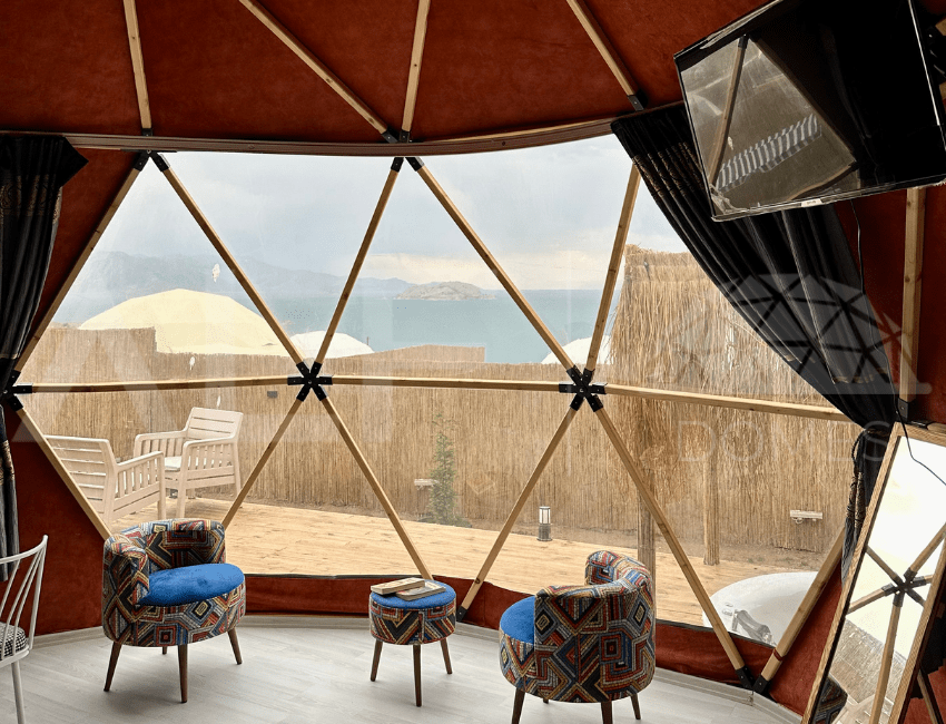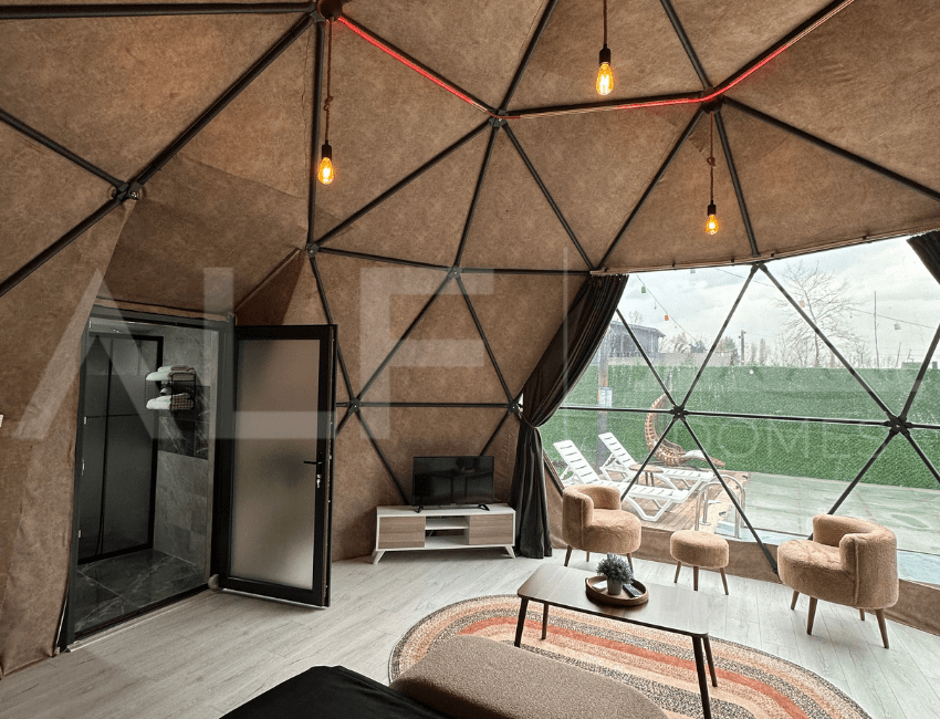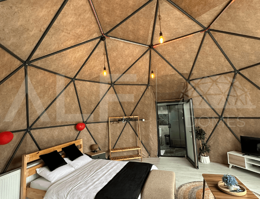 A6 Glamping Dome, aileler ve küçük gruplar için ideal bir yaşam alanı sunar. Ferah iç tasarımı ve fonksiyonel düzeni ile konforlu bir deneyim sağlayan bu dome, estetik ve dayanıklılığı bir arada sunar. Geniş iç hacmi ve modern donanımları ile kullanıcıların her türlü ihtiyacını karşılayacak şekilde tasarlanmıştır. Yüksek kaliteli malzemelerle üretilen bu dome, dört mevsim kullanılabilir ve mükemmel yalıtım özellikleri sayesinde her türlü iklim koşuluna uygunluk sağlar.