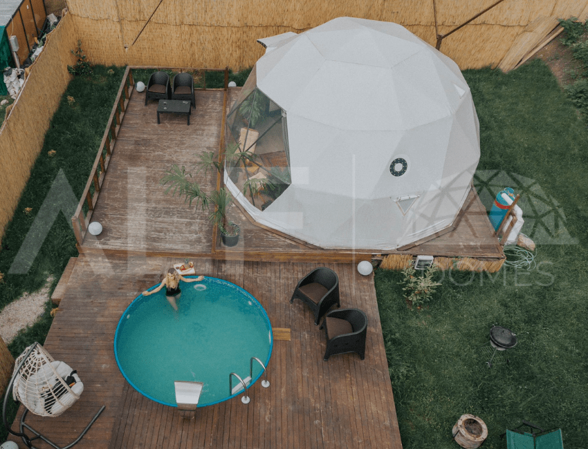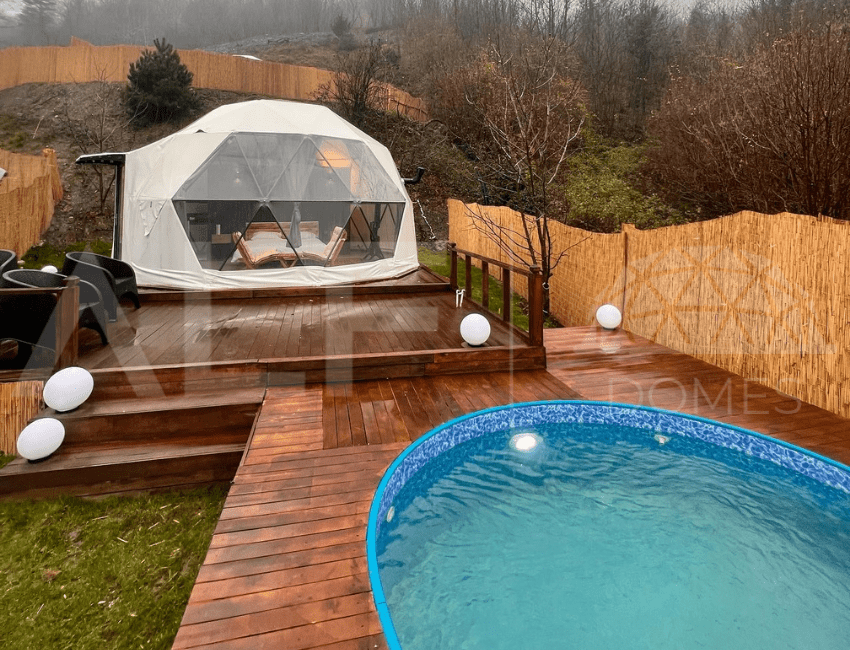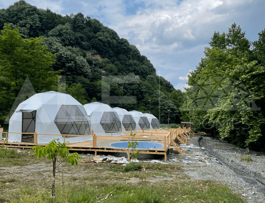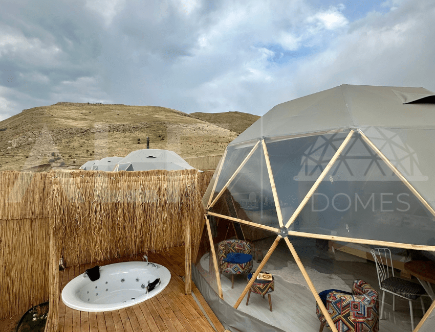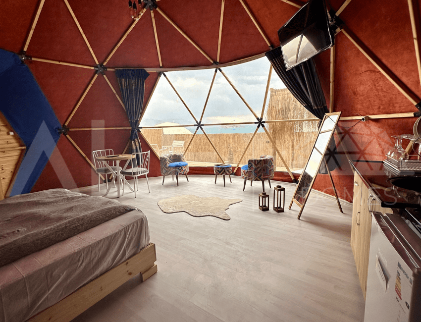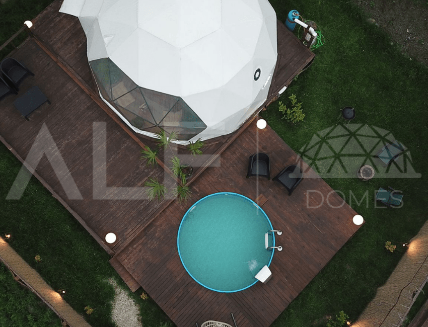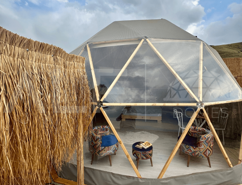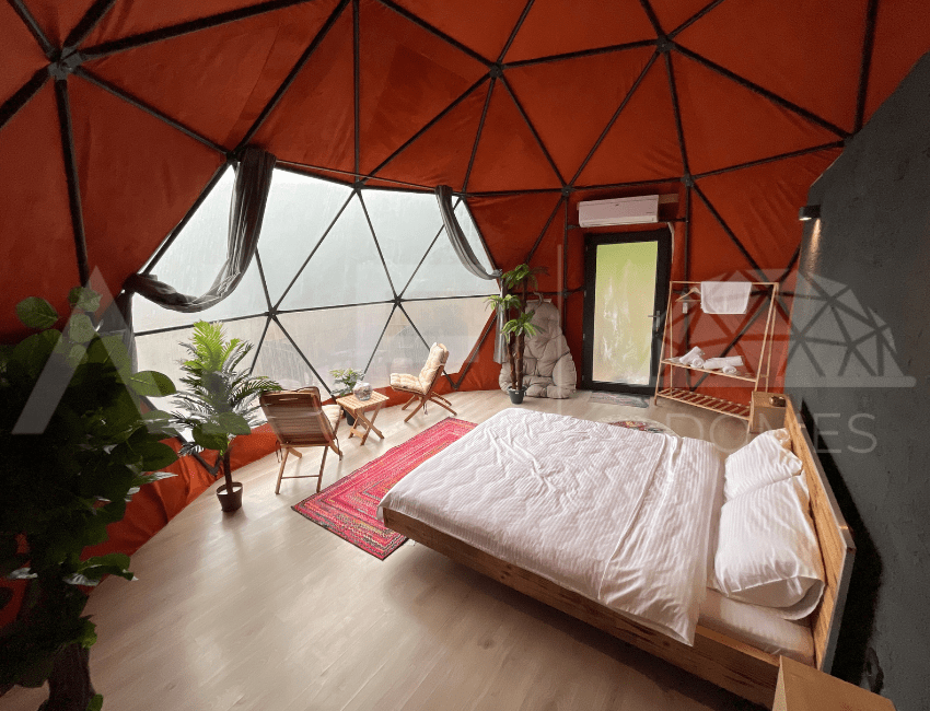 A6 Glamping Dome, aileler ve küçük gruplar için ideal bir yaşam alanı sunar. Ferah iç tasarımı ve fonksiyonel düzeni ile konforlu bir deneyim sağlayan bu dome, estetik ve dayanıklılığı bir arada sunar. Geniş iç hacmi ve modern donanımları ile kullanıcıların her türlü ihtiyacını karşılayacak şekilde tasarlanmıştır. Yüksek kaliteli malzemelerle üretilen bu dome, dört mevsim kullanılabilir ve mükemmel yalıtım özellikleri sayesinde her türlü iklim koşuluna uygunluk sağlar.
