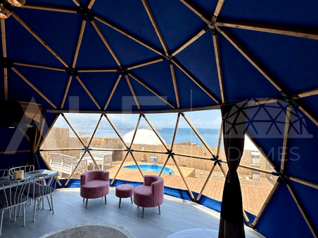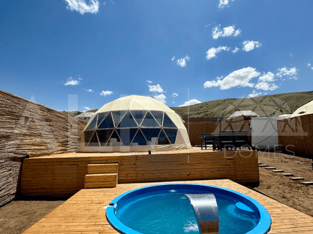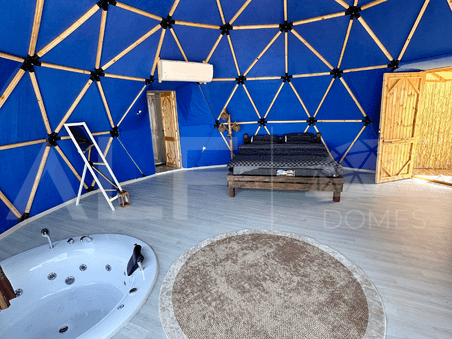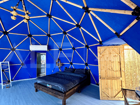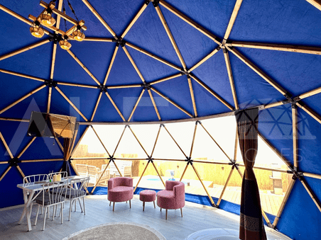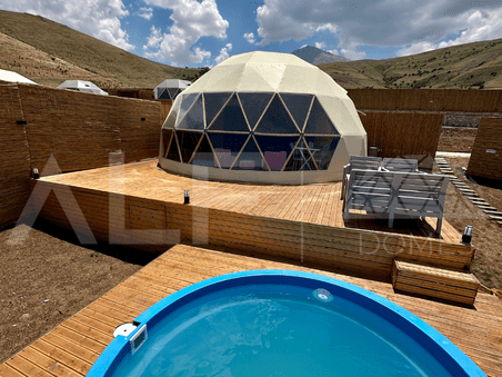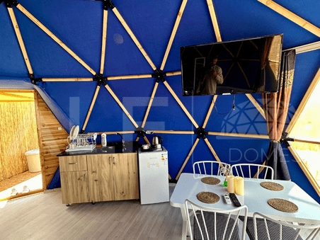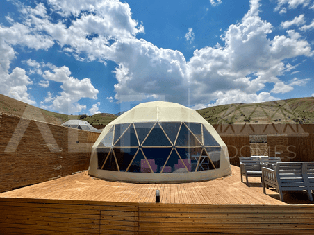 Das A7 Glamping Dome bietet einen idealen Wohnraum für Familien und kleine Gruppen. Mit seinem großzügigen Innenraumdesign und funktionalen Layout bietet dieses Dome ein komfortables Erlebnis und vereint Ästhetik mit Haltbarkeit. Es wurde entwickelt, um alle Bedürfnisse der Nutzer mit seinem großen Innenvolumen und modernen Annehmlichkeiten zu erfüllen. Dieses Dome, das mit hochwertigen Materialien hergestellt wird, ist für alle vier Jahreszeiten geeignet und bietet dank seiner ausgezeichneten Isolierungseigenschaften Eignung für jede klimatische Bedingung.